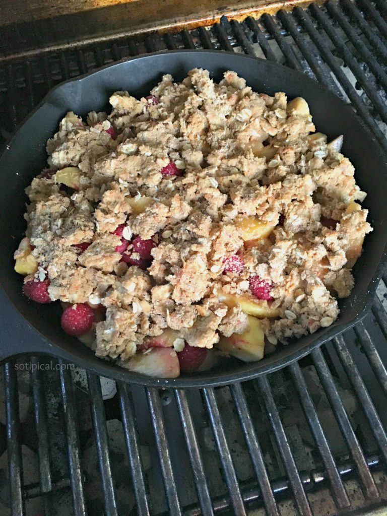Spread evenly over the fruit mixture. Place the skillet on the BBQ grill over indirect heat. Grill for about 30 minutes or until the topping is golden. After 15 minutes, start checking every 5 or so minutes to avoid burning, as heat will vary in different size grills. When done, remove from heat and allow to stand for about 10-15 minutes. Serve with whipped cream or a scoop of vanilla ice cream! YUM!