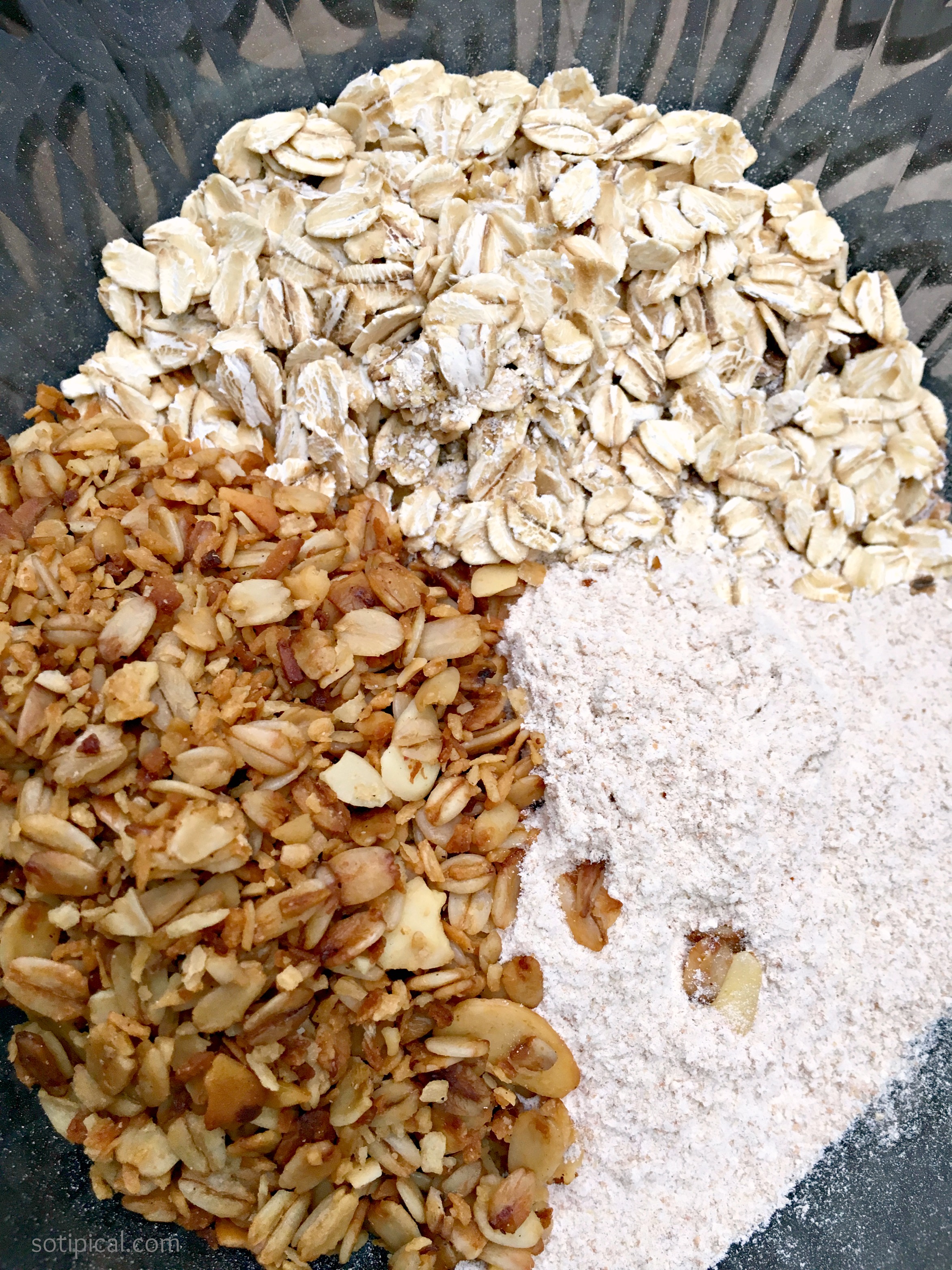 Next you will assemble the crumble topping. In a medium bowl, add oats, flour, granola and remaining brown sugar. Mix together. (I forgot the brown sugar when I took the photo, so I added it after I started mixing in the butter)