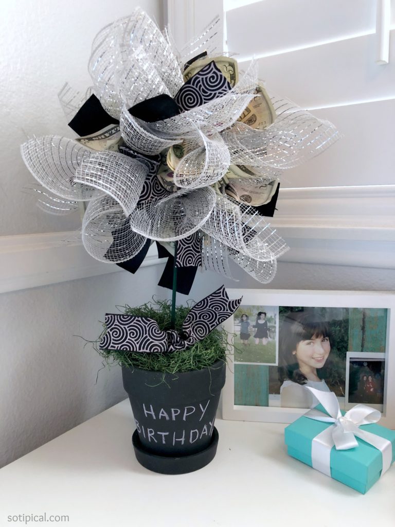 I am pleased with this money tree. Next time I may try more bills and less ribbon. It does take time, patience and a little practice to perfect! I love this DIY gift idea and so did my daughter. There are more money trees to come in the future!