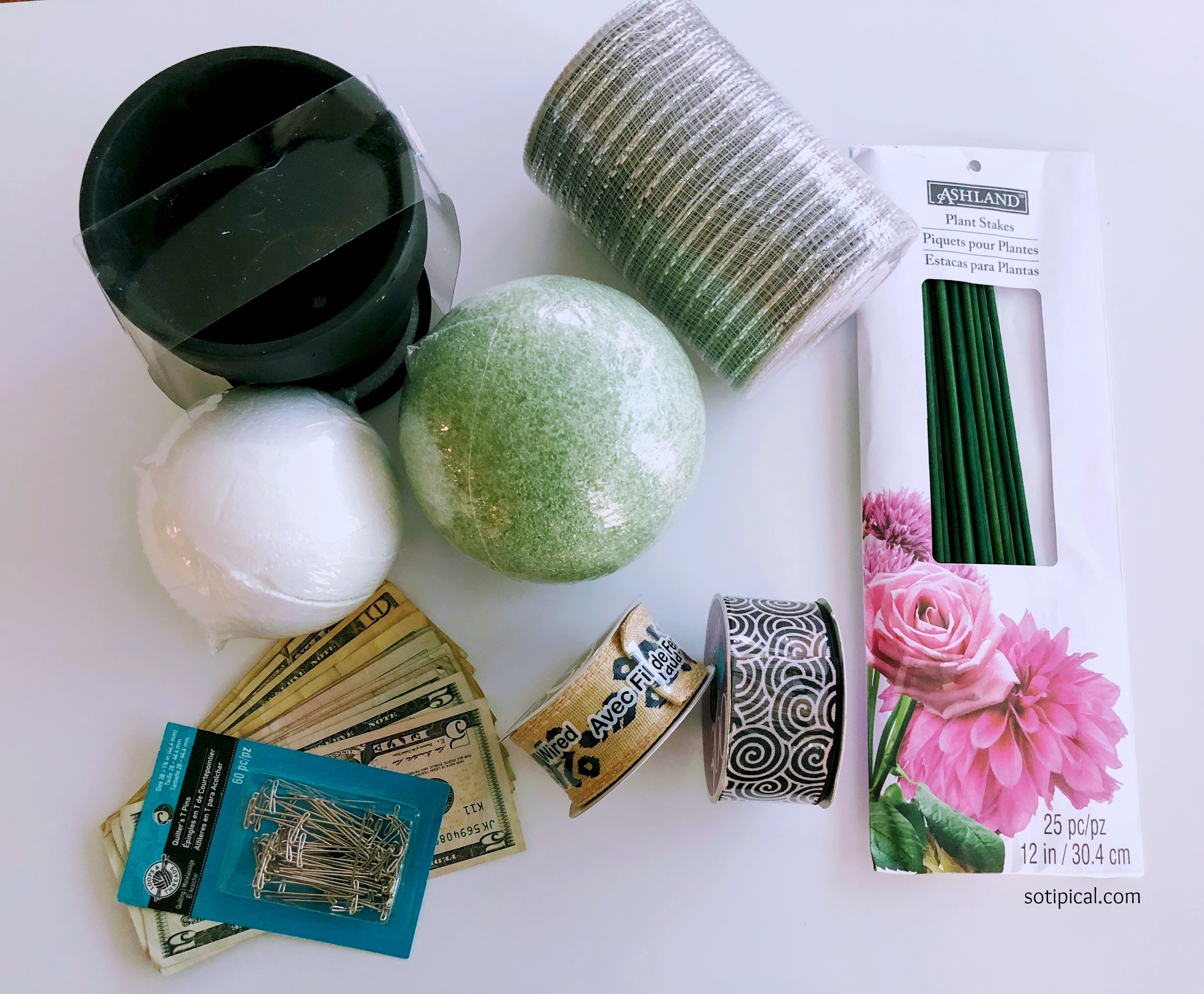 The money tree at the fundraiser was made up of $1 and $2 bills. On average, it would take about 50 or so bills to make up a topiary using a 5 inch styrofoam ball. I didn’t want to use singles, so I used $5 and $10, but added ribbon as filler. Here are the supplies you will need: