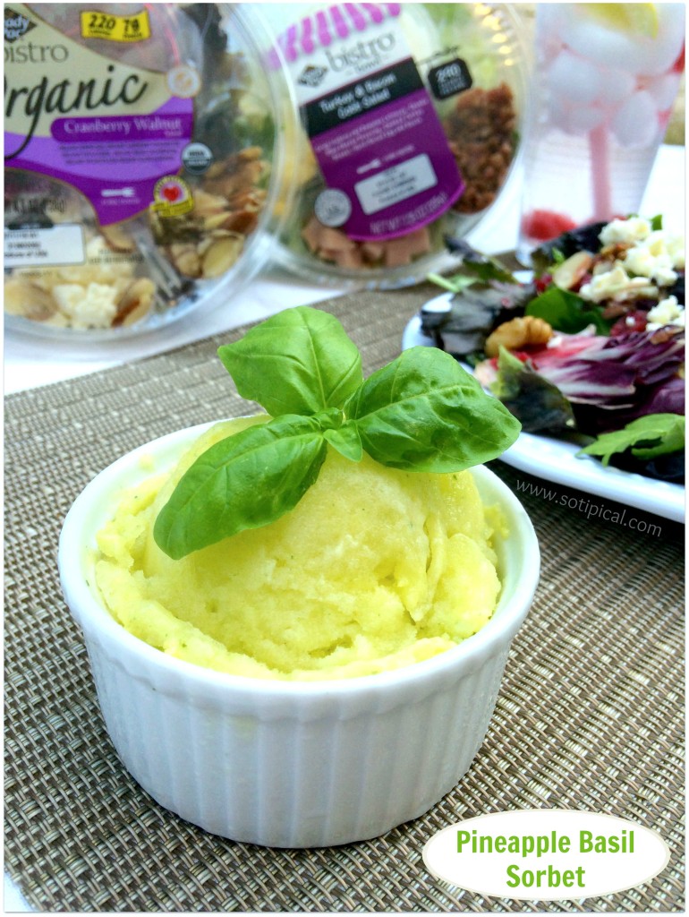 What beats a tasty salad followed by some refreshing Pineapple Basil Sorbet for dessert when you’re in the mood for a light meal? Most days, we like to eat salads for lunch. Saturdays are hectic, so we often take turns making lunch. Today, just my daughter and I were home so we decided to have a quick “girls lunch”. She would come up with the lunch and I would make a dessert!