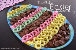 Easy Easter Dessert Tray – I found this simple idea on Momma Told Me. You will only need to arrange this platter. There is no preparation involved. Just purchase candy coated pretzels in pastel colors (I’ve been seeing them in the stores), along with a variety of chocolate cookies and/or candies. Alternate rows to create a decorated Easter Egg. You can make this in just minutes!