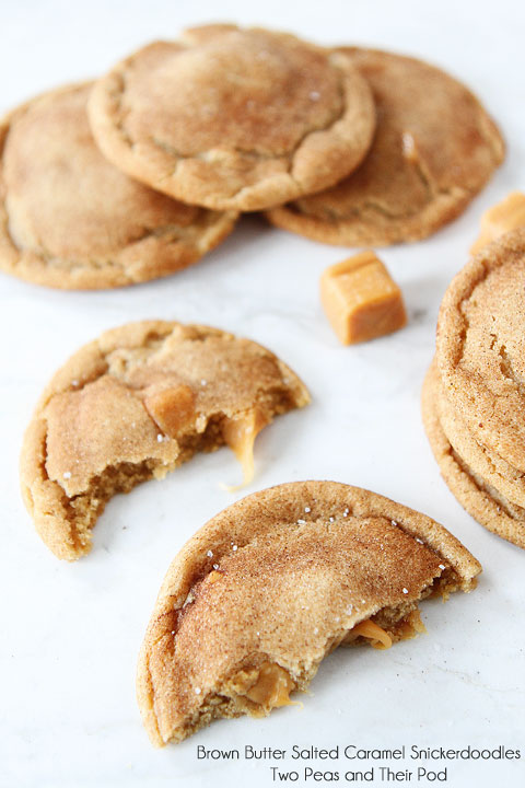 Brown Butter Salted Caramel Snickerdoodles by Two Peas and Their Pod – Being a big fan of anything snickerdoodle, this recipe immediately caught my attention! A chewy, buttery cinnamon cookie with a yummy caramel center!
