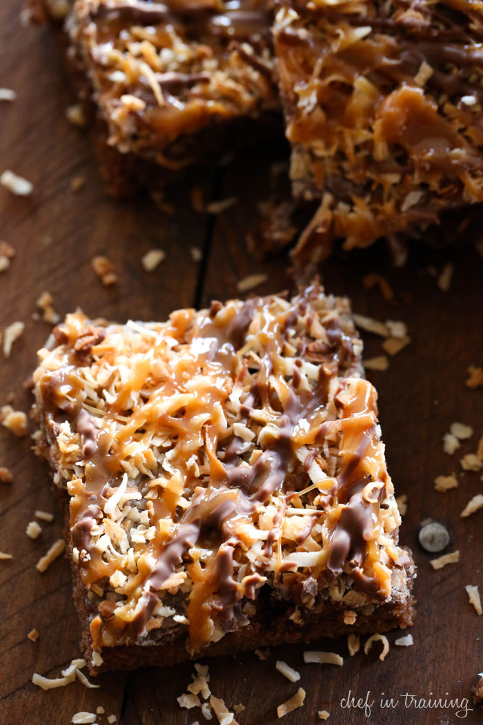 Samoa Sheet Cake by Chef In Training – All the awesomeness of the popular Girl Scout Cookie in a sheet cake. This looks dangerously delicious!