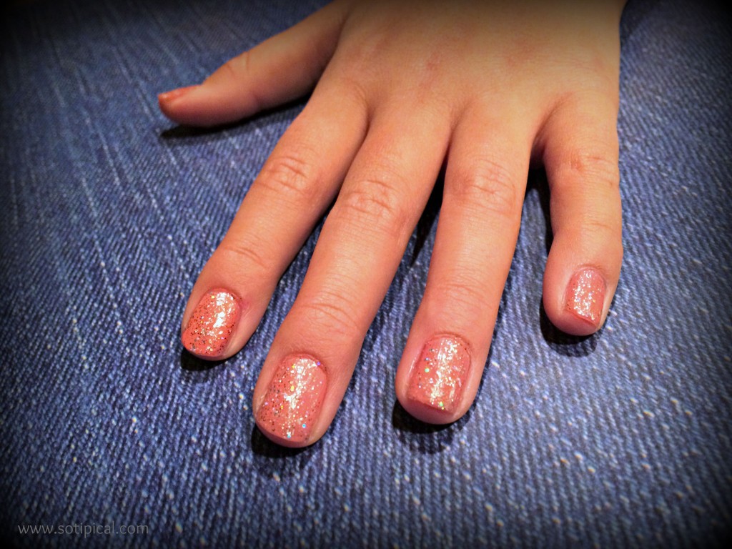 My youngest chose a pretty peach polish and topped them with glitter. This picture doesn’t do it justice. The shade is so beautiful and looks so lovely with her golden skin. This was my favorite!