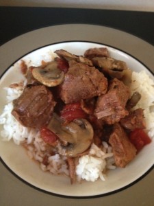 Cover and cook on low for 8 hours. When it was done cooking, I quickly sautéed 1lb of sliced mushrooms in a little olive oil and added it to the meat. We ate it over rice.