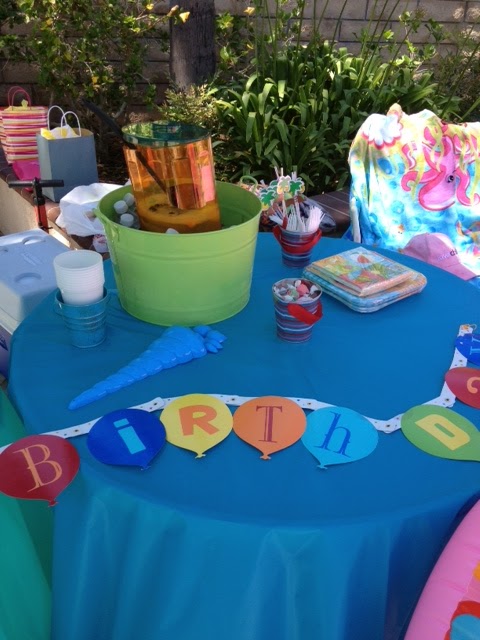 First were the goodie bags. I had blue lunch sacks that i previously purchased at Target. Then I got some sea life sticker sheets (.99ea) from the dollar spot. In each bag, we included an inflatable pool ring ($3), bubbles (3-pack for $1 at a dollar store), a Hawaiian lei (3-pack for $1 at a dollar store), and a snack size bag of Goldfish.