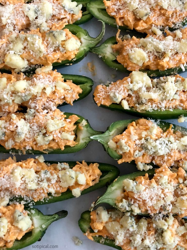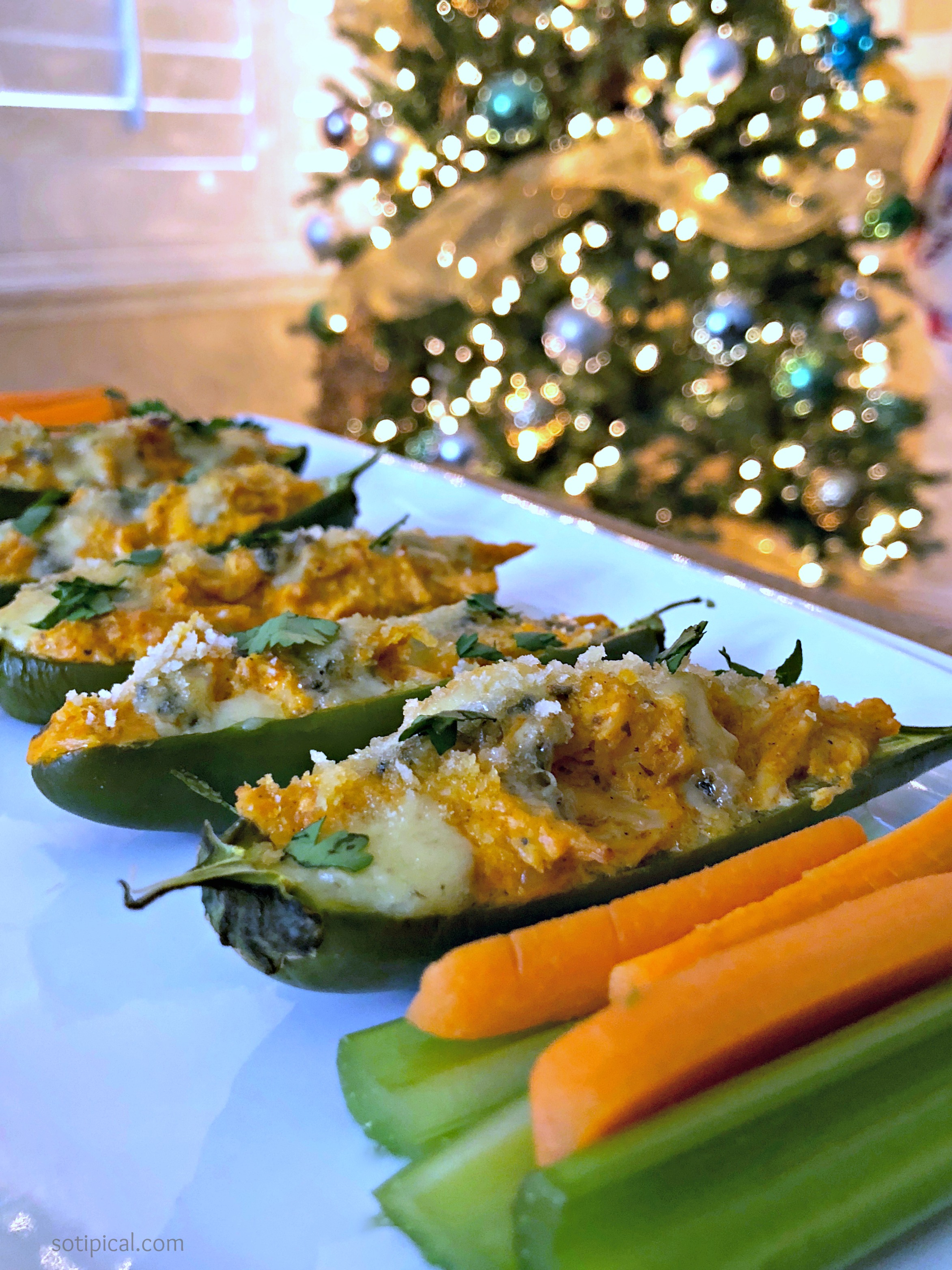 If you love Buffalo chicken and jalapeño poppers, then these Buffalo Chicken Jalapeño Poppers are for you! We love them so much that we may have inhaled eaten them for our dinner last night with some celery and carrot sticks on the side! Its a busy time of year and I usually spend more time planning and cooking for others. While I love to entertain, I never get to stop and enjoy what I cook because I’m focusing more on being the host. Plus, by the time I actually get to eat, the food is often gone! My family loves appetizers and sometimes we just have them for dinner instead of making an entree. As a treat, I will make some appetizers for dinner on a weeknight, because everyone will make the effort to carve out some time so we can slow down from our busy days and catch up.