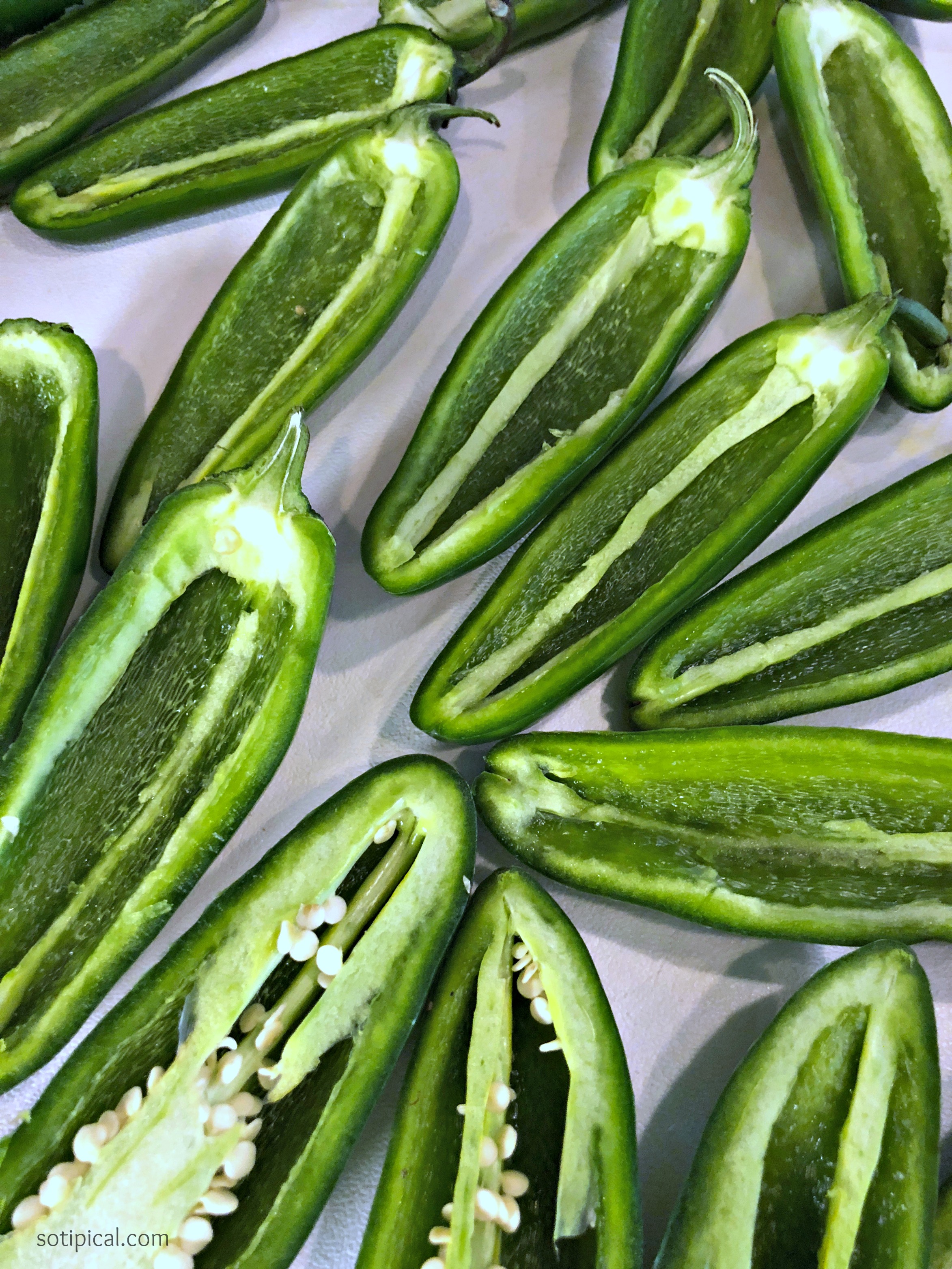 Clean your jalapeno peppers and slice them in half, longwise. Remove the seeds and discard. Most of the heat of a jalapeno pepper is in the seeds. If you handle them with your fingers, be careful about touching your face afterwards. Especially your eyes! Make sure you clean your hands very well! Once done, line them up on a baking sheet lined with parchment paper, then set aside.