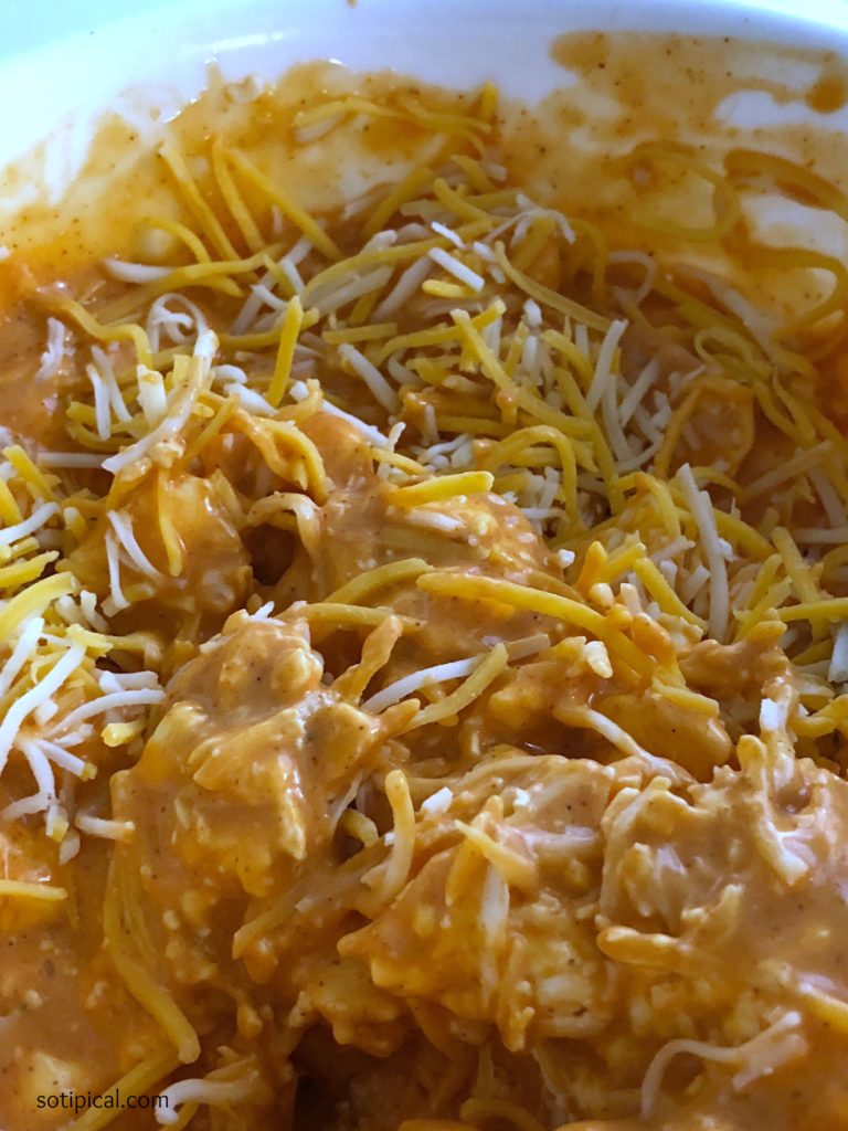 In a large bowl, add the cream cheese, Buffalo wing sauce and ranch dressing. Carefully mix until it is well blended. Now you will add the shredded cheddar.
