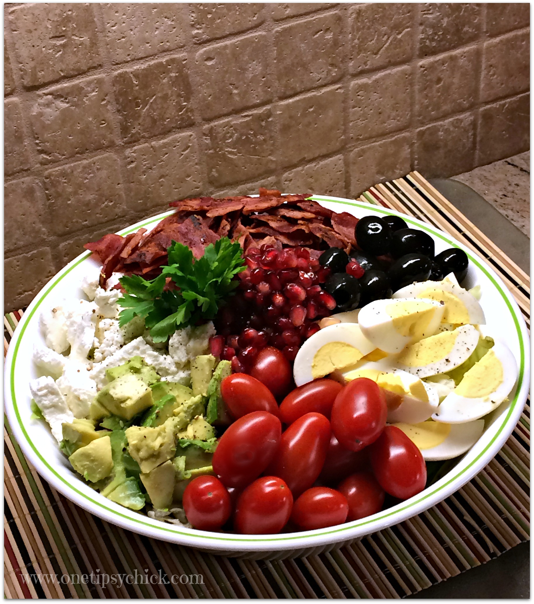 First I add the greens to the bottom of the bowl. Then I just arrange the cheese, avocado, bacon, tomatoes, olives and pomegranate over the top for a nice presentation. You can add or omit anything you like in your own version. Many salads I’ve ordered in California restaurants include goat cheese and/or avocado, which is what inspired me to include them in this recipe.