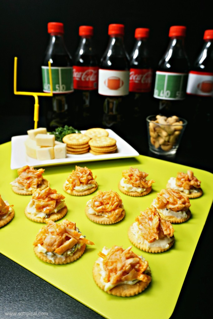 My girls love football gatherings. Not for the football part, but for the FOOD! They often request “football food” for dinner on the weekends. They love finger foods and appetizers. Now you may have seen me mention that even though they are fantastic eaters, they are also very picky in two areas. 1. They dislike 99.9% of all breakfast foods, and 2. They do not like sandwiches. They love bread, but not sandwiches. So over time, I discovered that if I put sandwich ingredients on a Ritz Cracker, they will eat it. They wouldn’t eat the buffalo chicken sliders I made last time. That is when I said that there will be Ritz Crackers involved next time and it was a big hit!
