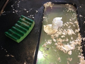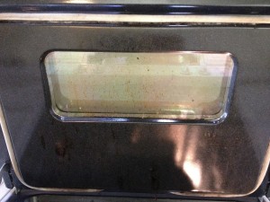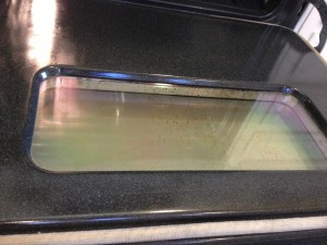 Once I wiped this clean, I realized that a fair amount of the splatter and grime was IN BETWEEN the layers of glass. I don’t really get how this happens. I pulled out the drawer underneath and found some vent holes at the bottom of the door. The challenge was to find a way to get up in there. Now here is where my “green” cleaning method became a lot less “green”.