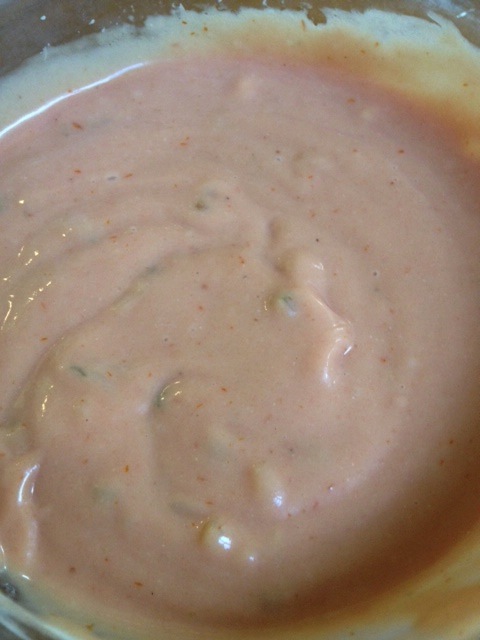 First I began with the “spread”, which is very similar to Thousand Island Dressing.  I mixed 3 parts mayo with 1 part ketchup.  Add 1 teaspoon dill relish.  Once blended, add about a teaspoon of red wine vinegar.  Consistency should thin out a little.  Chill until ready to use.