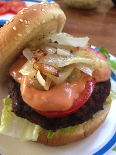 While the burgers were grilling, I fried up some onions in a little olive oil, until golden.  An “animal style” burger is not on the standard In-N-Out menu, but one of the most popular items on their “Not So Secret Menu”.  The burgers are mustard-fried, which is where you brush yellow mustard on your burger before you grill it.  It is topped with lettuce, tomato, fried onions, spread and you can add pickle and cheese, if desired.