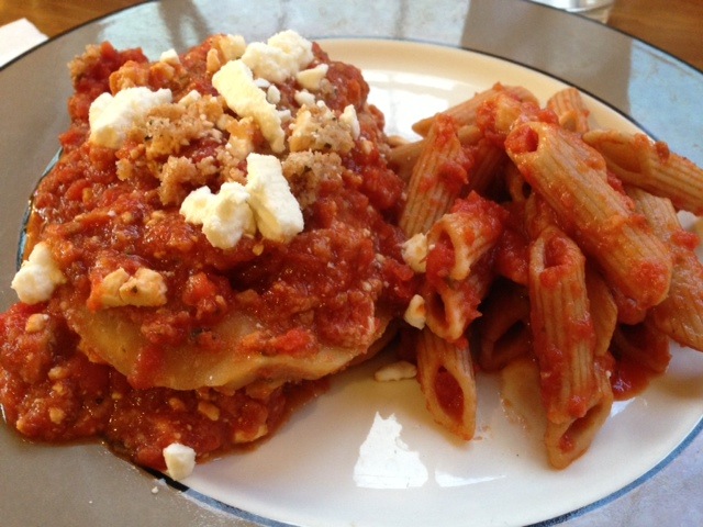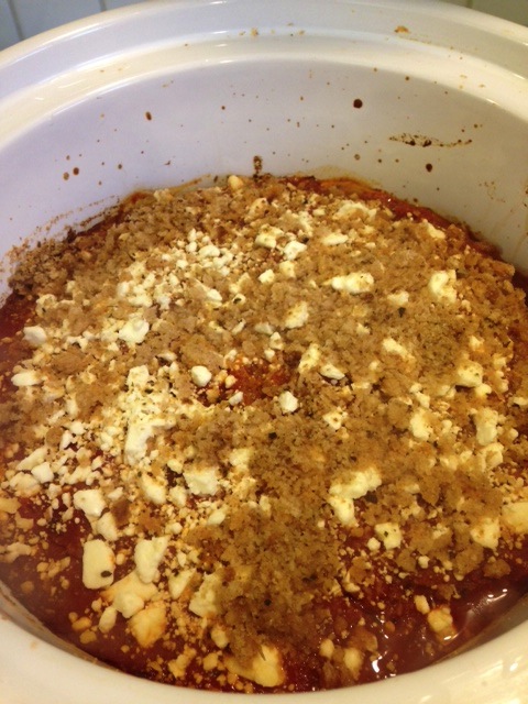Add some of your favorite pasta sauce to just cover the bottom of your crock. Brush each slice with some olive oil and coat both sides with breadcrumbs. Place in a thin layer on the bottom of your pot. Spoon some sauce over the eggplant and spread lightly with the back of your spoon. Sprinkle a little Feta Crumbles over the top and repeat layering until your eggplant is used up. Cover the top completely with sauce and another sprinkle of Feta Crumbles. Cover and cook on high for 4 hours. If your pot runs hot, check after 3 hours to see if the eggplant has softened enough. You’ll see below that I added the remaining bread crumbs to the top, but I wouldn’t do this again. They were kind of soggy.