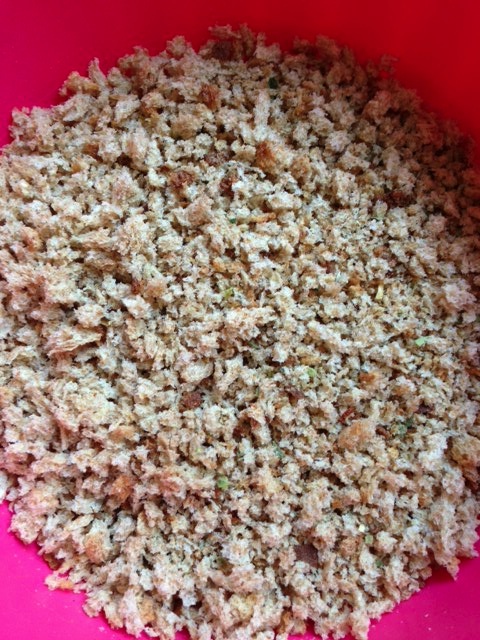 First, I realized that I didn’t have enough breadcrumbs, so I toasted some sliced wheat bread until slightly crunchy, then cooled completely. I broke the 3 slices of bread into smaller pieces and put them in my Vitamix with a pinch of oregano, salt and pepper. On a low setting, I pulsed until the breadcrumbs formed. Then I put them in a large shallow bowl and set aside.