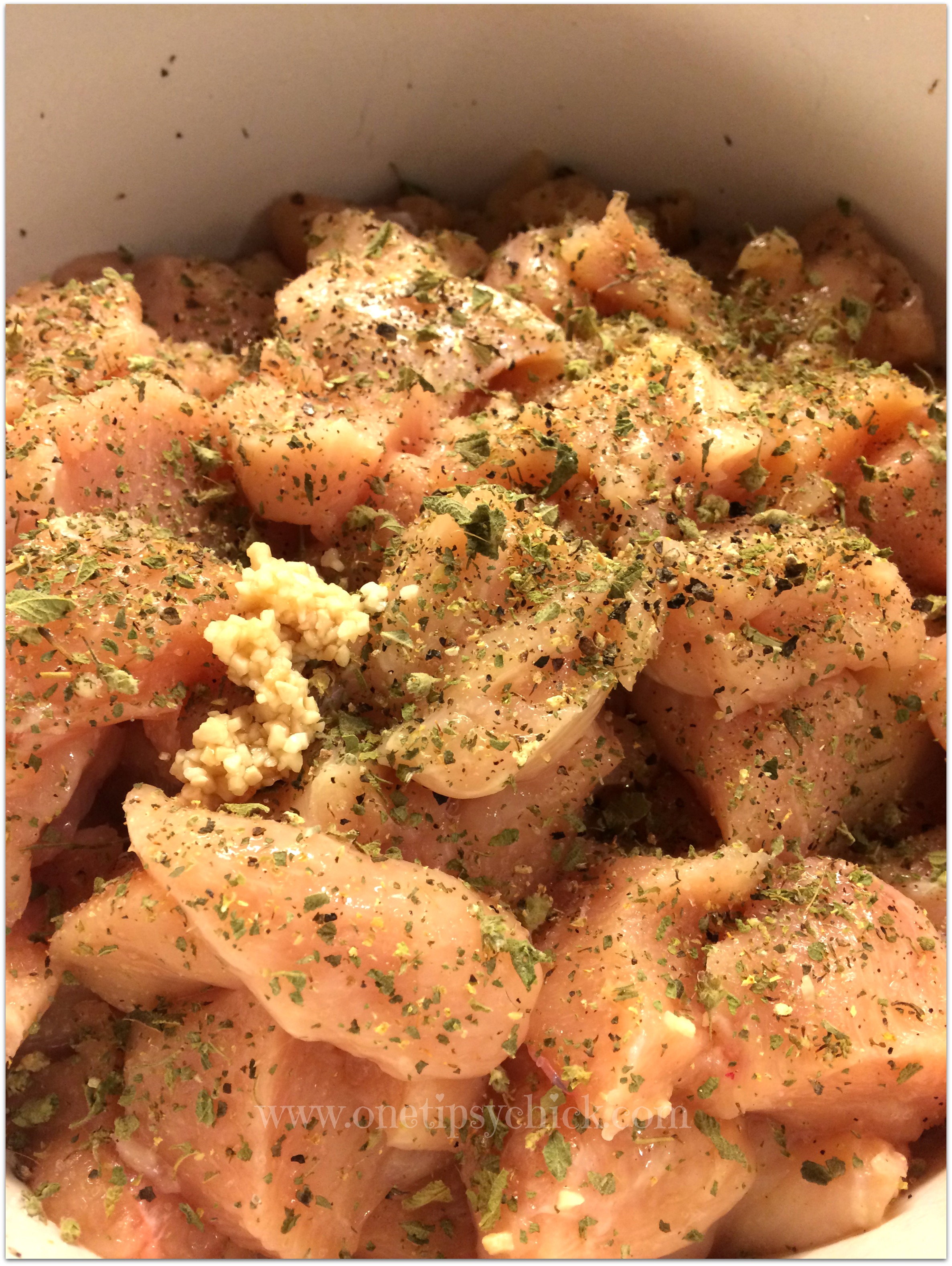 Spray the inside of your crock pot. Cut chicken into bite sized pieces, then place in pot. Season with salt, pepper, oregano and garlic.