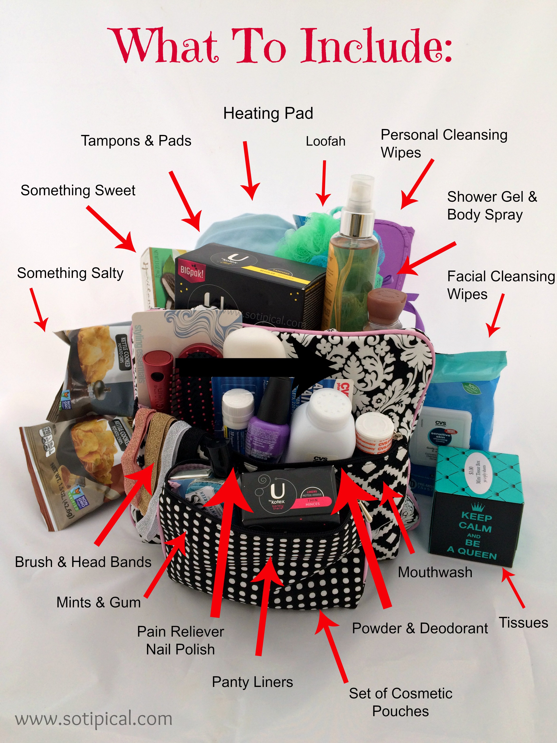 Some of these items are great for keeping in your purse, backpack or gym locker. I chose a 3-pack of cosmetic pouches, so each can be filled with all the necessary items a girl could need during her time of the month. A large pouch could hold her tampons, pads and wipes at home. Medium pouch for personal items to carry in her backpack or dance/sports bag. Small pouch may include items like a comb, mints, perfume, liners, lip gloss, nail polish, pain reliever, etc.- things you’d carry in your purse.