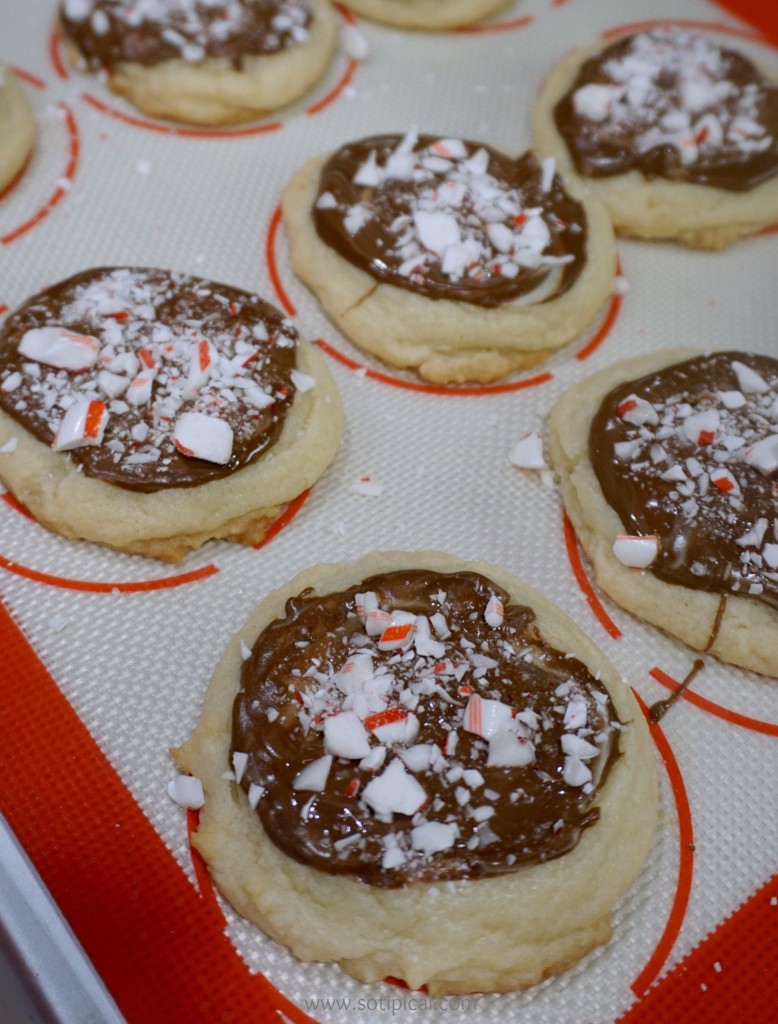 After the chocolate is spread over each cookie, sprinkle the crushed candy cane over the top of each cookie.