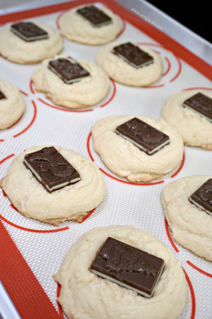 As soon as you remove the cookies from the oven, place a chocolate candy in the center of each one. Allow to sit for a few minutes, but I was in a hurry, so I actually popped the pan back in the oven (which was turned off by now) for about 30-45 seconds. The chocolate candy softened right up. You will now spread the melted chocolate over the cookie with a butter knife or even the back of a spoon, to coat the top of the cookie. Now I forgot to snap a photo of this step, but you can see an example here in one of my older posts.