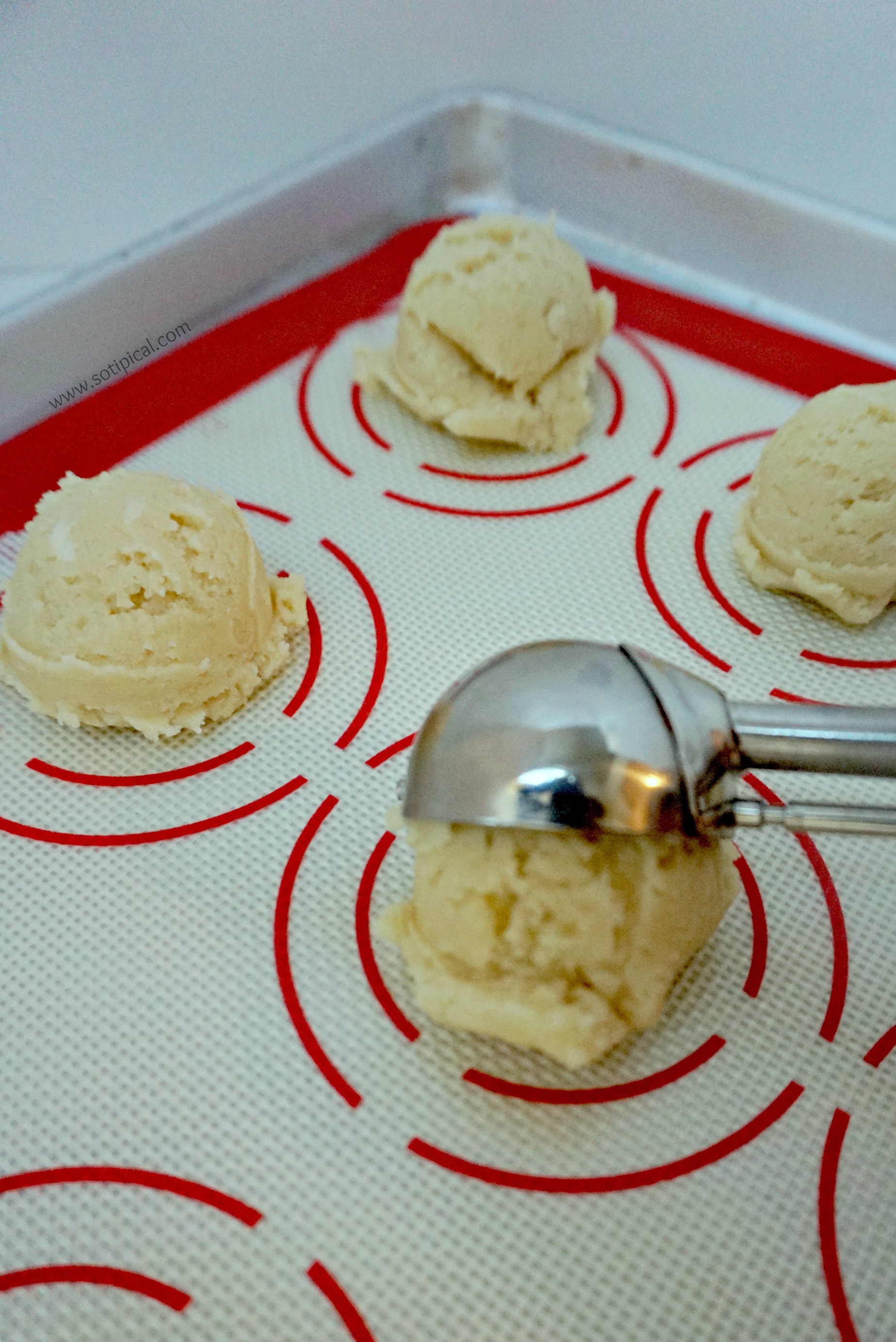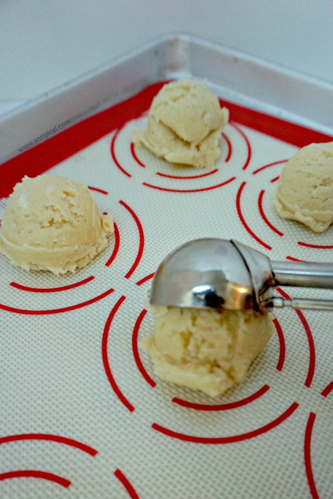 In a large bowl, beat the egg, water and butter together until smooth. Slowly add in the sugar cookie mix and combine until a soft dough forms. I use a cookie scoop to make evenly sized cookies, but you can also roll the dough into about 1 inch balls. (Before I got the scoop, I would scoop out the dough with TBSP measuring spoon that I coated with cooking spray to keep the size even)