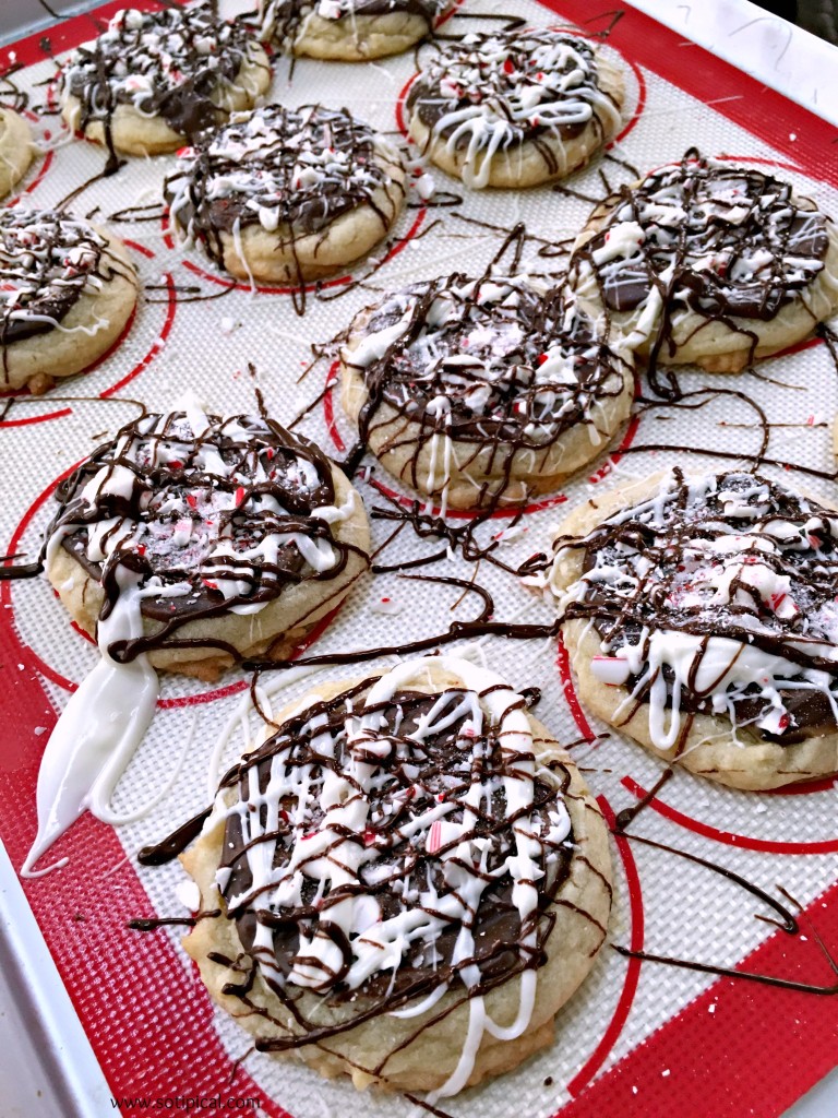 The cookies now need to cool completely. The chocolate also needs to set and firm up. I would wait at least an hour, though I waited about 3 hours. (No particular reason other than I had errands to run.) Melt the white chips in a microwave safe bowl in 30 second intervals, stirring in between. It should not take more than 1 minute to melt 1/4 cup of white chips. Stir with a fork until smooth. Drizzle the melted white chocolate over the cookies in multiple directions. Then do the same with the chocolate bark. Allow both layers of drizzled chocolate to firm up before removing from the baking sheet.