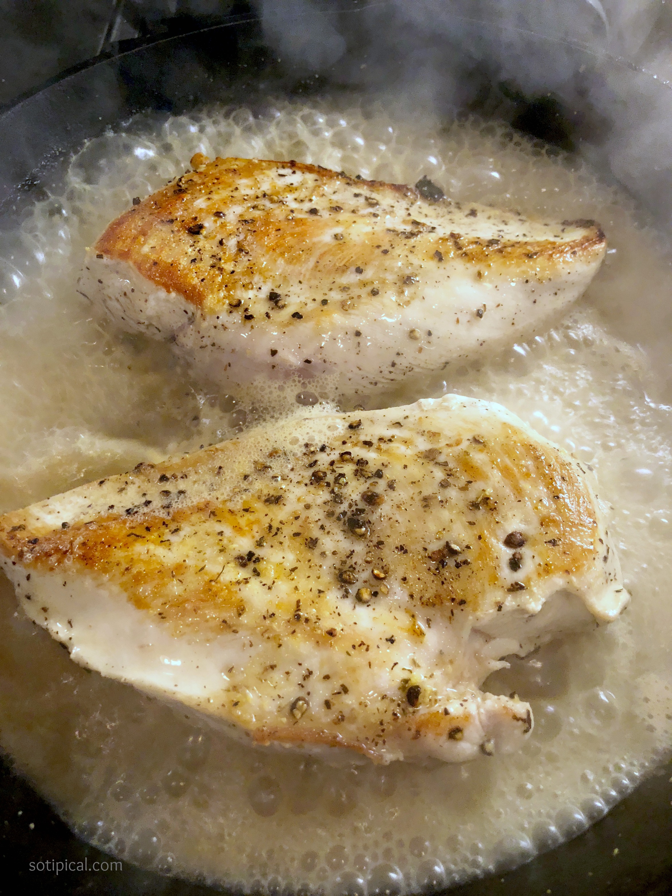 Once 5 minutes has passed, flip the chicken breasts over and add about 1/2 cup or chicken broth. Reduce heat, cover and cook for another 8-10 minutes.