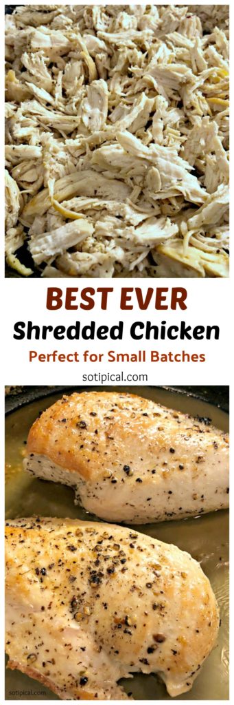 I never really thought about making shredded chicken on my stove top. I’ve made chicken in a skillet countless times, but I always sliced it. The one time I did try, it was a disaster. The chicken was dry and didn’t shred at all, but eventually I learned a little secret that made all the difference! I immediately tried it and I was surprised at how well it turned out! Its so quick and easy, that I doubt I’d make it in a crock pot again unless I needed a really large batch.