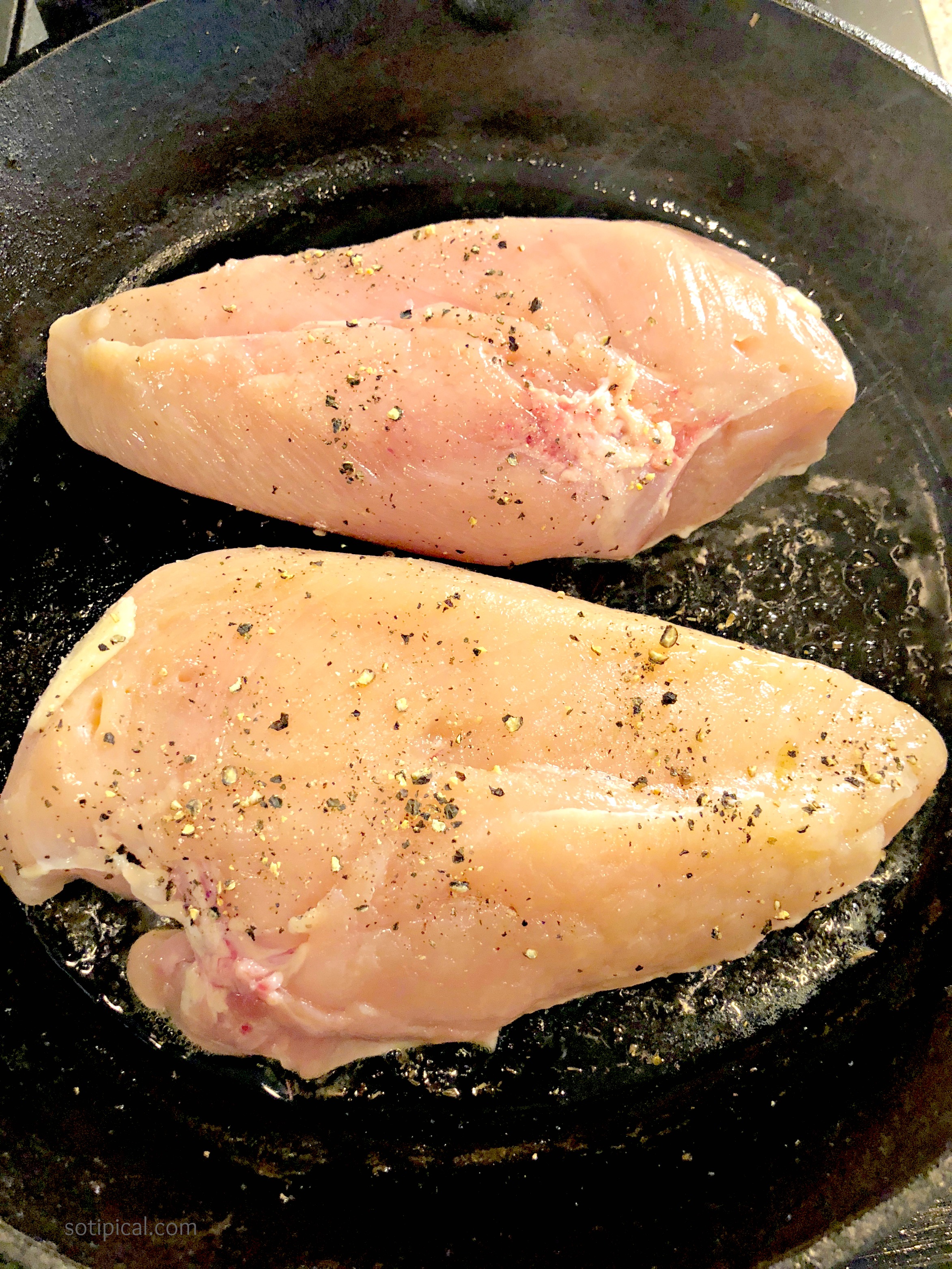 Begin with 2 chicken breasts. Pat them dry and season with salt and pepper. Heat oil in a large skillet. Place chicken in the pan. Do not flip or move them for about 5 minutes.