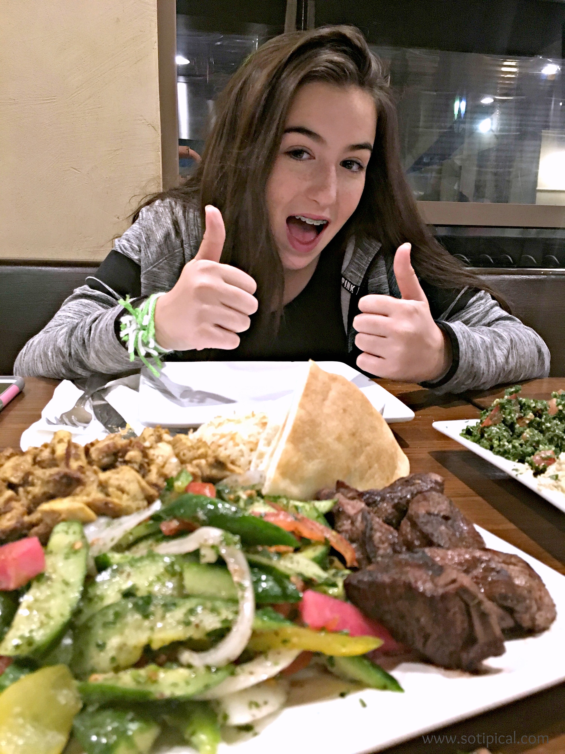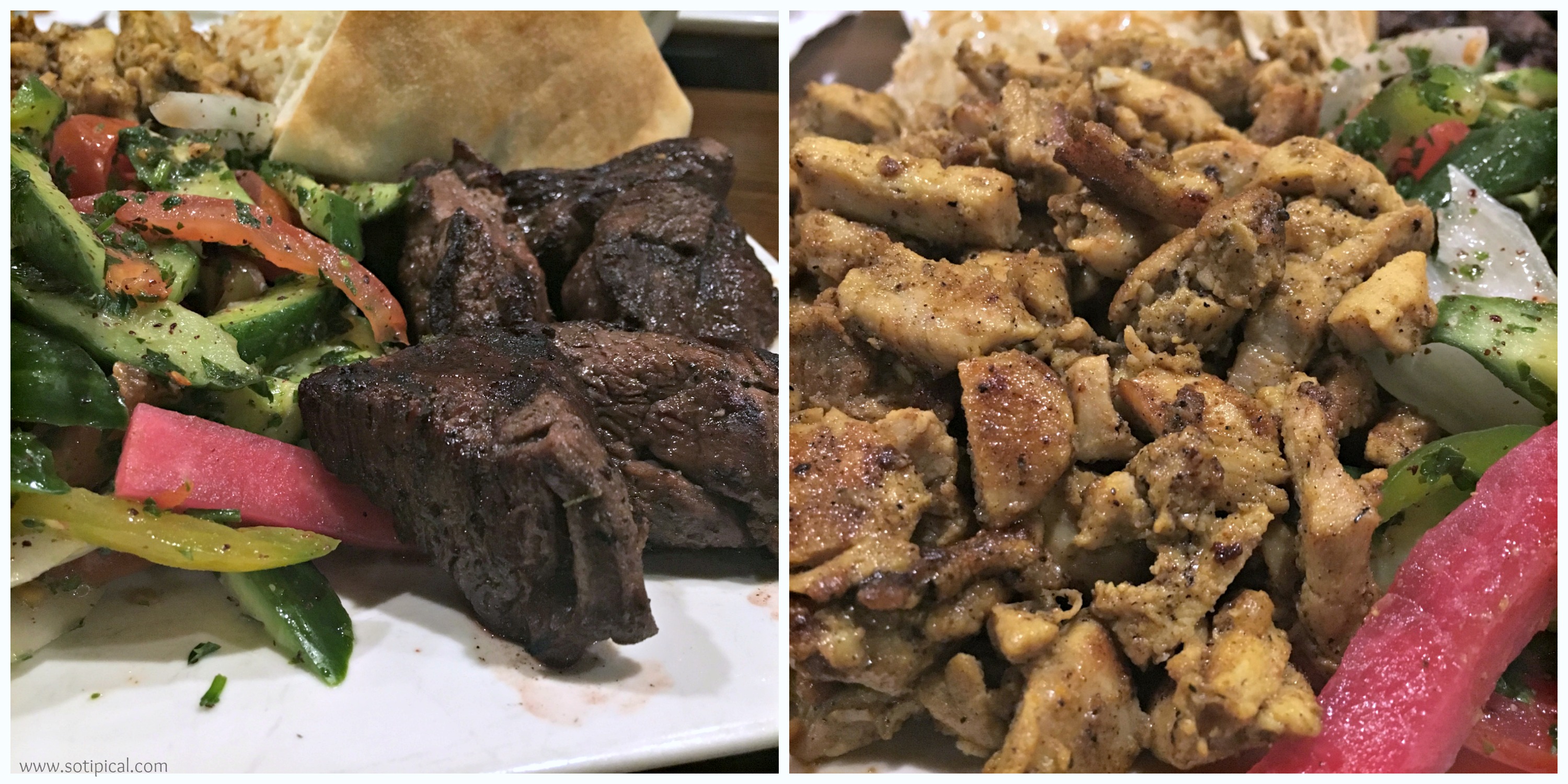 We were getting full, but there was so much more to try and we couldn’t wait! For our main course, we enjoyed the Beef Kebab, which is grilled, marinated chunks of filet mignon and Chicken Shawarma, grilled thinly sliced chicken. On the side we had Mediterranean salad and Rice. The meat was perfectly grilled and so tasty. Every bite was better than the next!