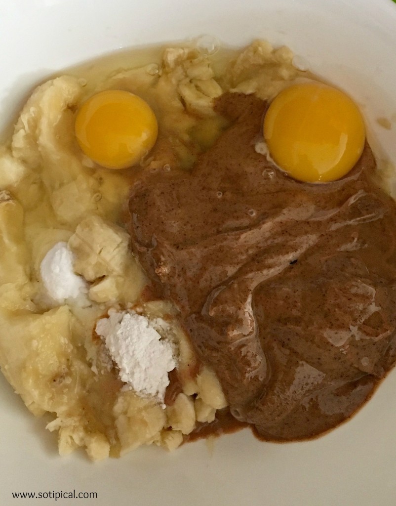 Combine bananas, almond butter, eggs, baking powder, baking soda and cinnamon.