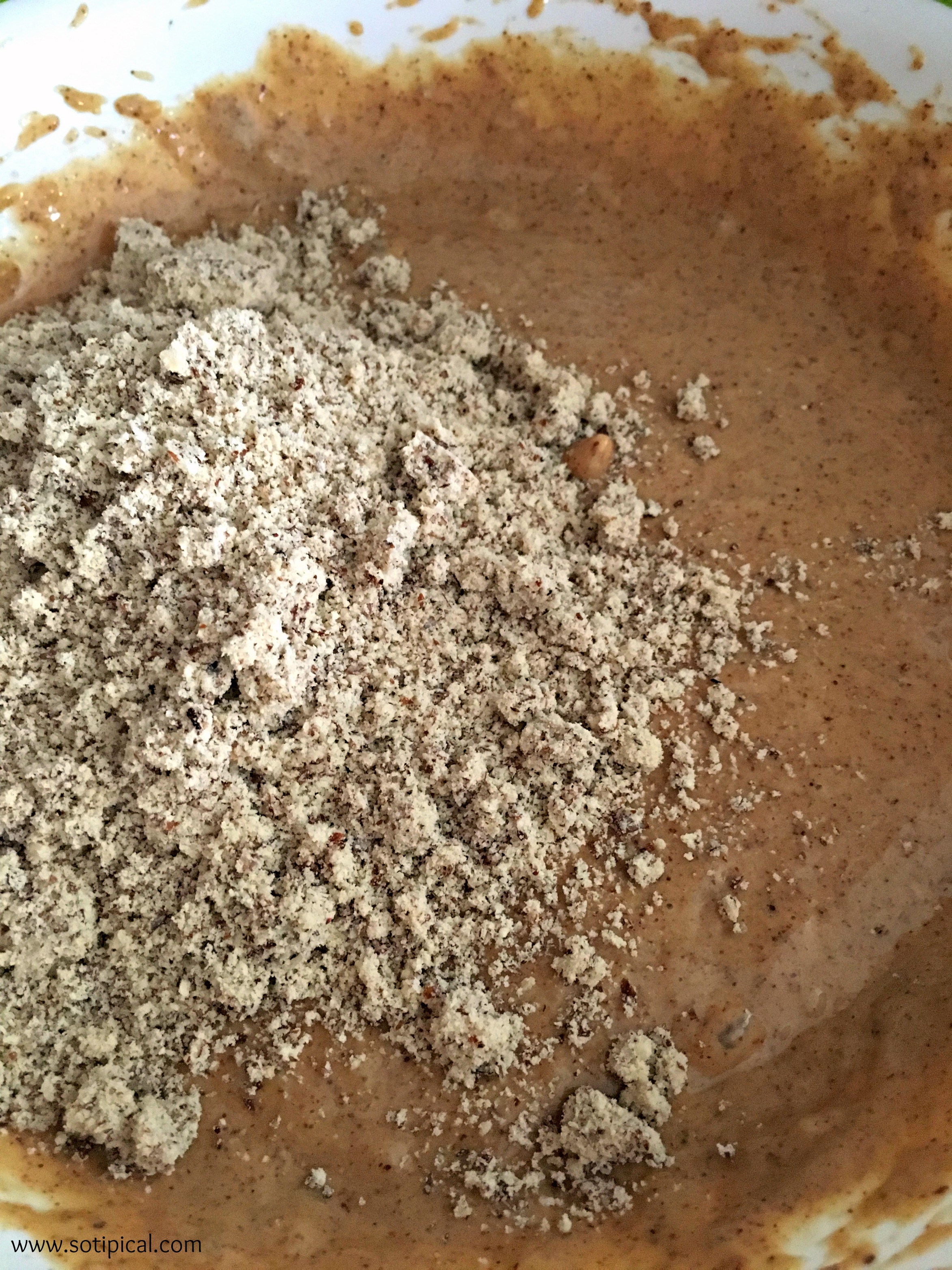 Once the mixture is well blended, slowly add the almond meal. Scrape down the sides of the bowl as you are combining it