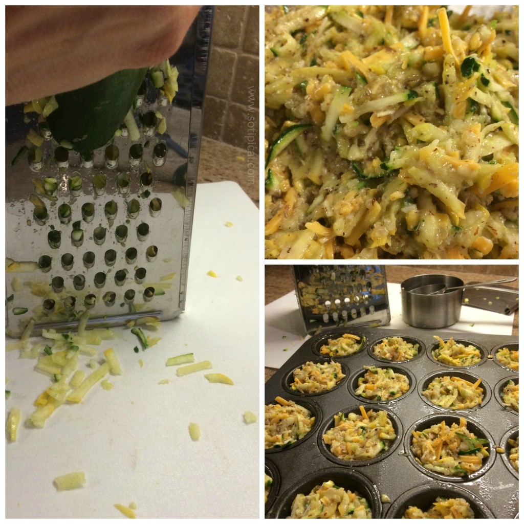 First grate the zucchini and place in a large bowl. I used 1 yellow and 1 green to get the 2 1/2 cups. Finely chop your onion and add to the bowl. Then mix in the quinoa, almond meal, cheddar and parmesan. Add your salt, pepper and Italian seasoning. Once this is well blended, beat your eggs in another bowl and add to the zucchini mixture.