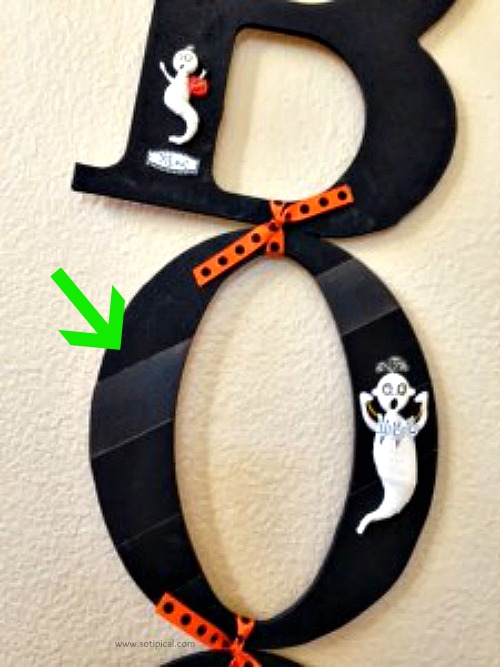 So maybe this considered to be wall art, more than a Halloween BOO “wreath”. I’ve been seeing several Halloween BOO wreaths on so many blogs and boards, that I decided to try one of my own. I’m not crafty, so it was a bit of a challenge for me, but it turned out well enough for me to actually hang up! I began with the wooden, unfinished letters from Hobby Lobby, for $2.49ea. I also bought 3 small bottles of acrylic paint – black, orange and “glow in the dark”. Each bottle was under $1.50. My initial thought was to paint the letters black and do orange and glow in the dark polka dots. As you can see in this photo, neither worked over this black paint. I hoped that doing stripes would allow me to have more even layers of paint and that it would show up brightly, but that didn’t work either.. It was bright enough that you could actually see the stripe in this photo, but most of the time, its not really visible unless you’re close up.