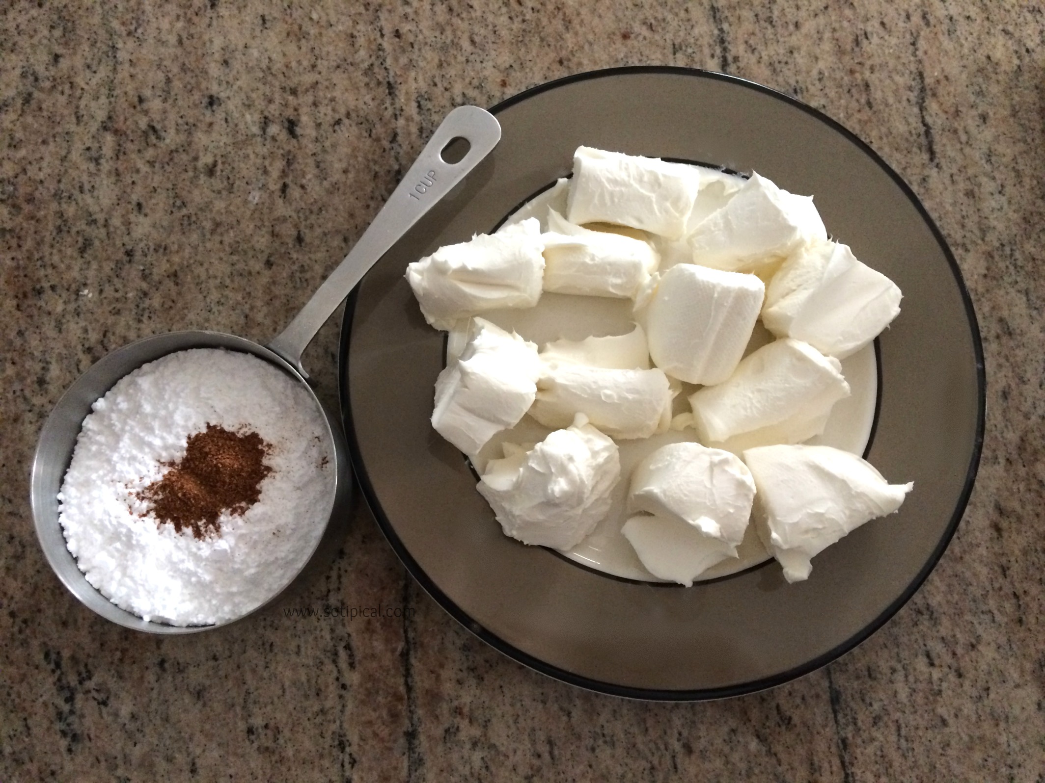 After they are done, allow to cool completely. I waited at least an hour. You don’t want the warm cookie to melt the cheesecake filling. During the cooling time, set out your cream cheese to soften a bit. I like to cut mine in slices to speed it up a bit. I find that allowing to soften whole, results in soft, room temp cream cheese on the outside, with cool, firm cream cheese in the center. Measure out the powdered sugar and cinnamon. With an electric mixer, beat the cream cheese until fluffy. Slowly add the sugar and cinnamon until well blended. If you are not ready to assemble, then cover and refrigerate the cheesecake filling in the mean time.