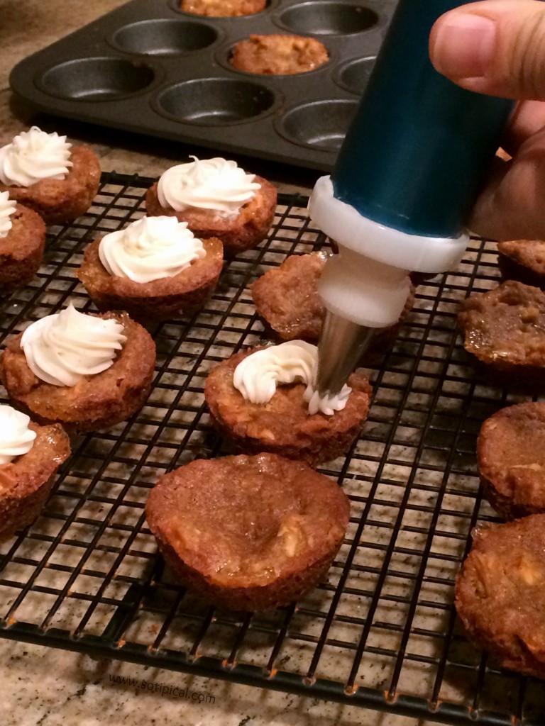 Now it is time to “frost” the cookie cups and make the Harvest Apple Cheesecake Bites! You can do this in a few different ways. First, you can just spread the cheesecake mixture over each one, as if you were frosting a cupcake. The next way is to add the cheesecake mixture in a sandwich baggie, cut off a small corner and pipe onto each one. I decided to use a cake decorating kit. I filled the applicator with the cheesecake, selected the tip I wanted and piped it onto each cookie cup. Afterwards, I refrigerated them for about 20 minutes before serving.