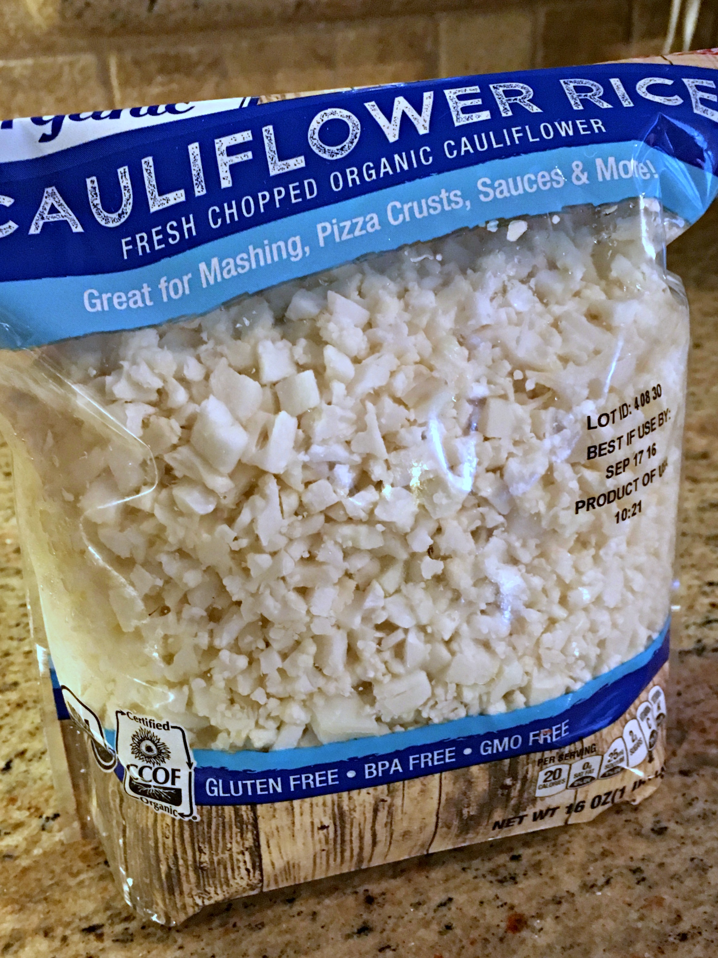 So you may be wondering if there is such thing as a “healthy enchilada casserole” and the answer is YES! I actually made 2 pans of this casserole this week. The first one was devoured while my back was turned and I never got to take a photo of the finished product. (#BloggerProblems) Both times, the kids at seconds, brought some for lunch to school and never once realized it was loaded with cauliflower!!! Thats right, cauliflower. I found this bag of Cauliflower Rice while grocery shopping last week. I had “riced” a head of cauliflower before, but this was the first time I had seen it sold this way at my local market. SCORE! But getting back to the casserole, it was virtually undetectable and you couldn’t taste the hidden veggies at all. Everyone thought it was onion and maybe some rice.