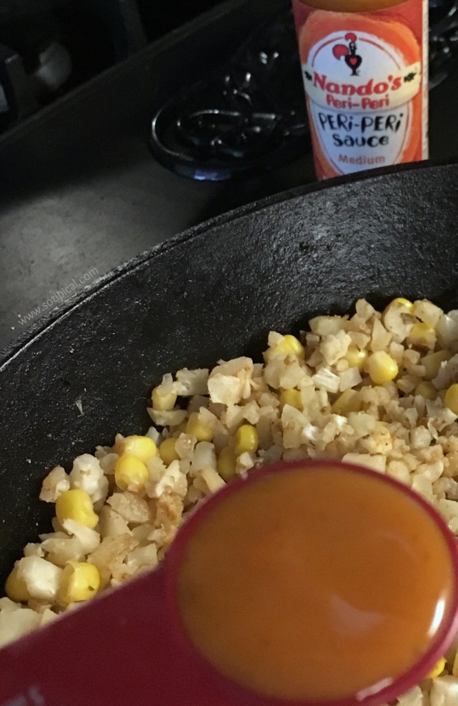 Place a large skillet over medium heat and add olive oil. Once hot, add diced onion and raw riced cauliflower. Next add the corn, cumin, oregano, salt & pepper. Continually stir until seasoning is well distributed. Add a teaspoon of Peri Peri sauce and cook for another minute or two. Remove from heat and set aside.