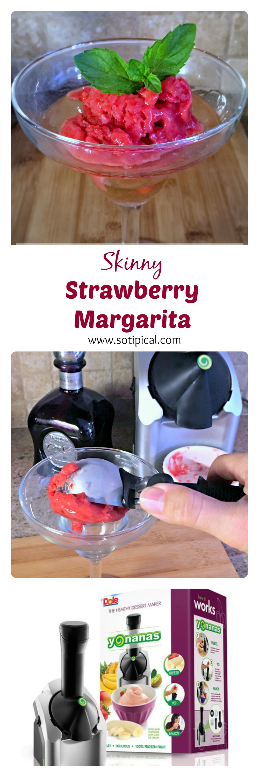 Place frozen strawberries in Yonanas machine to make a “sorbet”. Scoop into glass, then pour tequila over it. Add mint leaves for garnish. (If desired, before you fill glass, either wet the rim with water or rub a slice of lime around it, then dip into sugar.) For a more blended margarita, simply stir until blended, then enjoy!