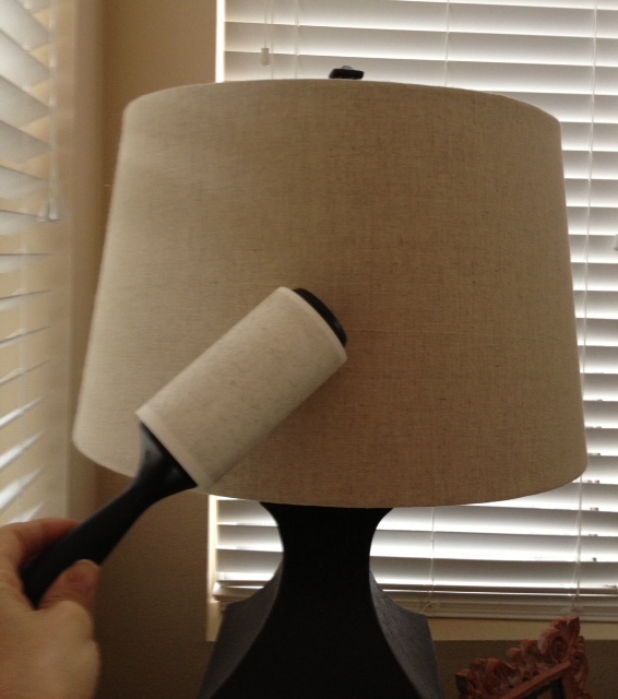 We have a little dog who jumps up on the top of the sofa to nap when we aren’t home. While I was cleaning up the hair she left behind with my lint roller, it hit me. Would this work on the lamp shades too? And it did work, very well. I have a variety of lampshades in the house and use this method for most of them. Some of the more delicate shades could be damaged from a lint roller so be very careful. If you have tiny beads, sparkles or any other embellishment, I would not recommend this method. The adhesive could easily pull or remove them. I do not use a lint roller for “paper” shades either. Instead I use the vacuum or a duster. This is best for plain fabric lampshades.