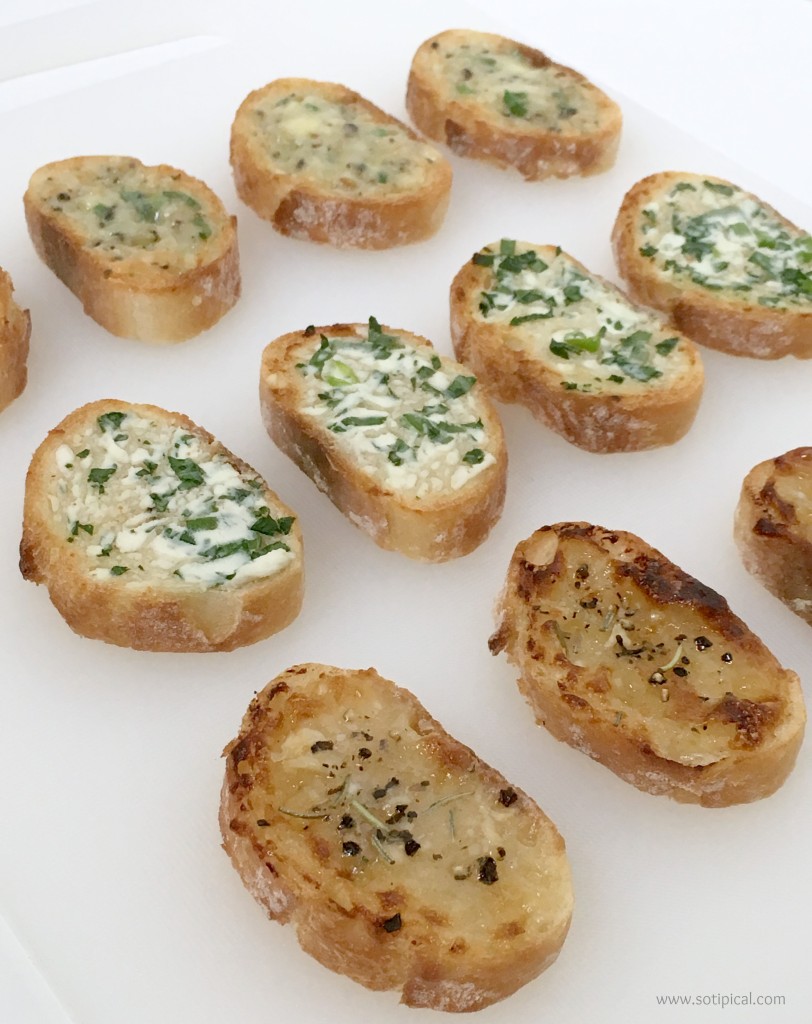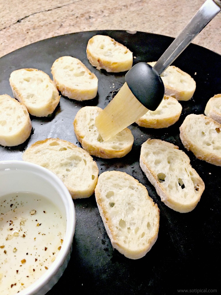 I buy a fresh baguette and ask the bakery department to slice it for me. This way all the slices are an even thickness. Preheat oven to 300 degrees. Add a couple of tablespoons of olive oil with desired amount fresh chopped garlic, salt and pepper. Bake for about 4-5 minutes, flip, then bake another 4-5 minutes so both side get crisp.