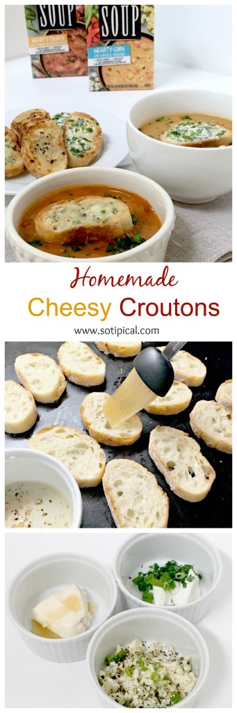 Have you ever wondered how to make cheesy homemade croutons yourself? Here is my easy recipe that will work well with salad, soup, chili and stew! Today I made 3 varieties of cheesy homemade croutons to pair with two different types of the new Good Natured Soups by Progresso™, Hearty Tomato with Spinach & Roasted Garlic and Hearty Corn and Chipotle Chowder. A perfect lunch for a Meatless Monday!