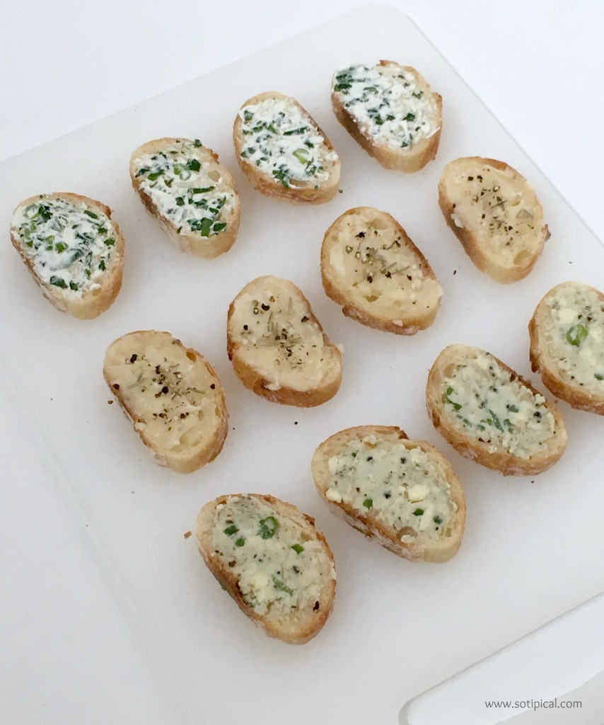 Mash the cheese mixtures to create a spread. Brush a very thin coating on each crouton. The second row below is my Brie and Honey spread. I topped them with Fresh Pepper and Rosemary. Such a tasty combo!
