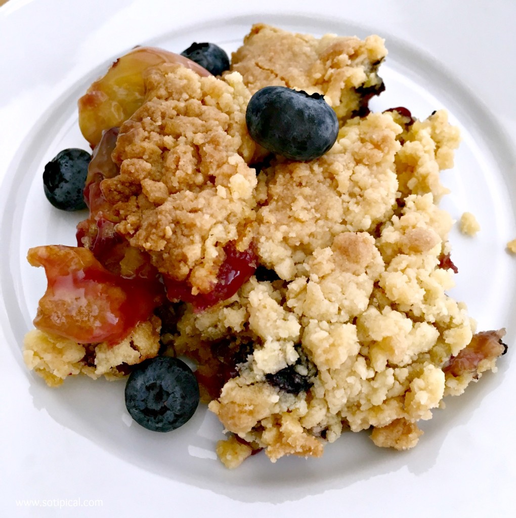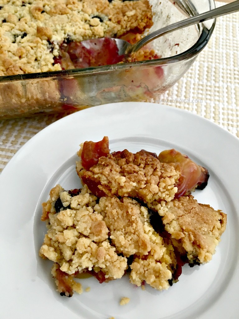Spread cake and butter mixture evenly over the top of the pie filling and blueberries. I literally crumbled it over the top with my fingers.