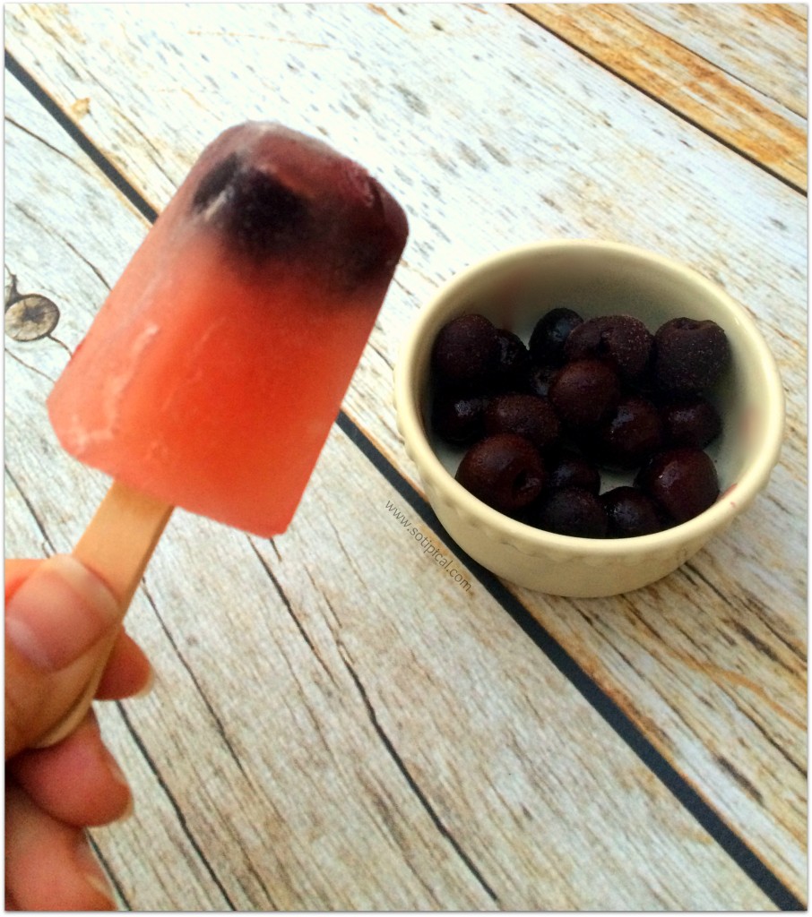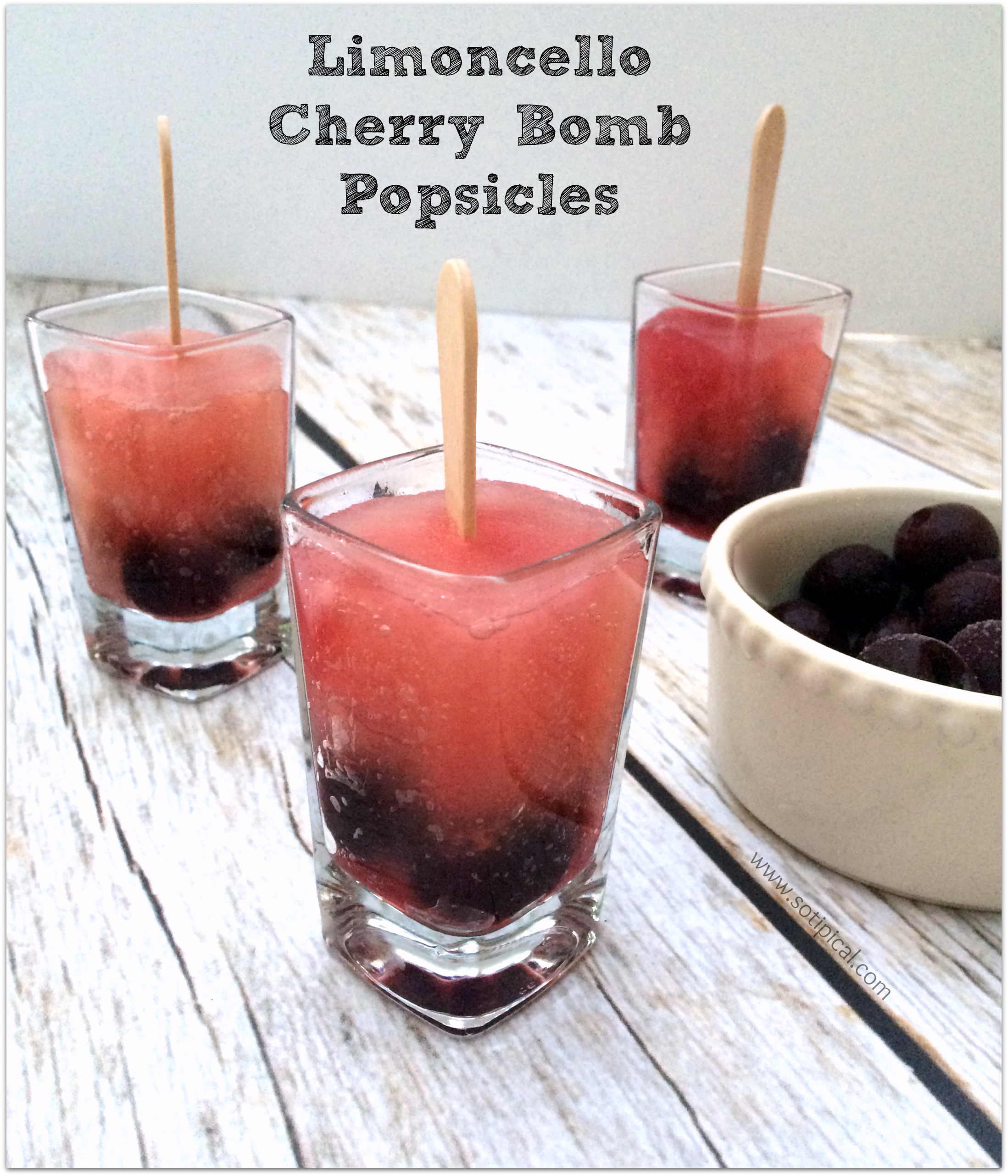 Happy hour just got cooler with these Limoncello Cherry Bomb Popsicles! A perfect balance of tart lemon and sweet cherries with a little kick! So cool and refreshing! Its been pretty warm here so I was looking for a light and frosty dessert option to serve at a dinner party. Very often we like to have a small sweet after dinner, but sometimes other dessert options seem to heavy when its hot out. We make popsicles for the kids all the time, so I decided that I would make some for just the grownups, that were a little smaller and a little less sweet.