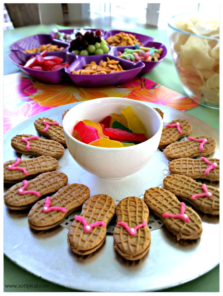 The girls worked up quite an appetite, so they had some yummy treats before and after lunch! My original plan was to serve teriyaki chicken with rice, but they girls wanted chicken strips with Polynesian sauce, carrots with ranch and fruit. The flip flop cookies were a big hit and so easy to make! Just Nutter Butter cookies and icing, but the Swedish fish were definitely the first to go! The drinks were mini bottles of water and punch made with Tropical Rainbow Sherbet and Sierra Mist with a splash of lemonade.