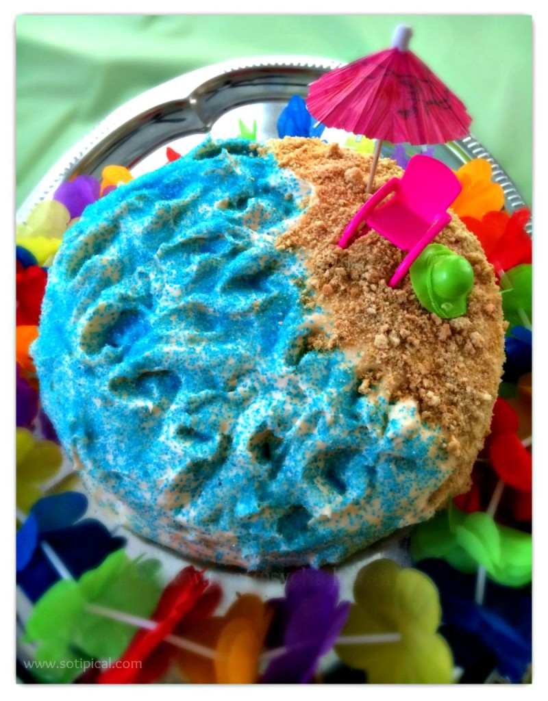 And finally was the cake! My daughter wanted another beach cake. I made a similar cake for her last party, but she liked this one much better. This time I made a vanilla cake, with a double batch of her favorite cream cheese frosting. You can find the frosting recipe here. Since we are still half packed from our move, I couldn’t find my cake decorations, so we improvised and used some Polly Pocket items instead!
