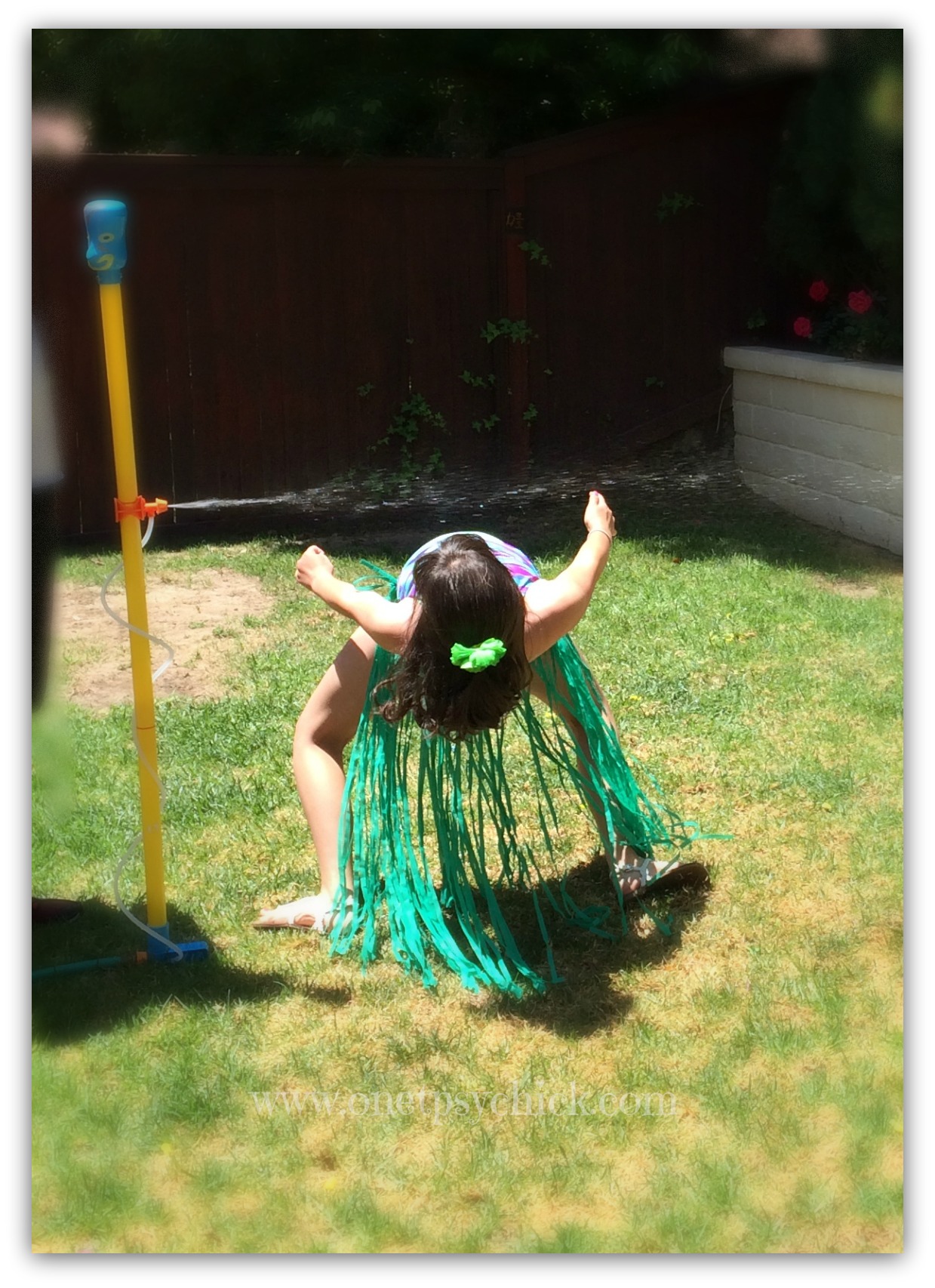 We found a tropical music station on iTunes radio and it was the perfect background to the hula dancing and our first “wet” activity! Water Limbo! I stumbled upon this awesome sprinkler toy at a discount store on the clearance shelf. SCORE! They had a great time and this was our big winner!