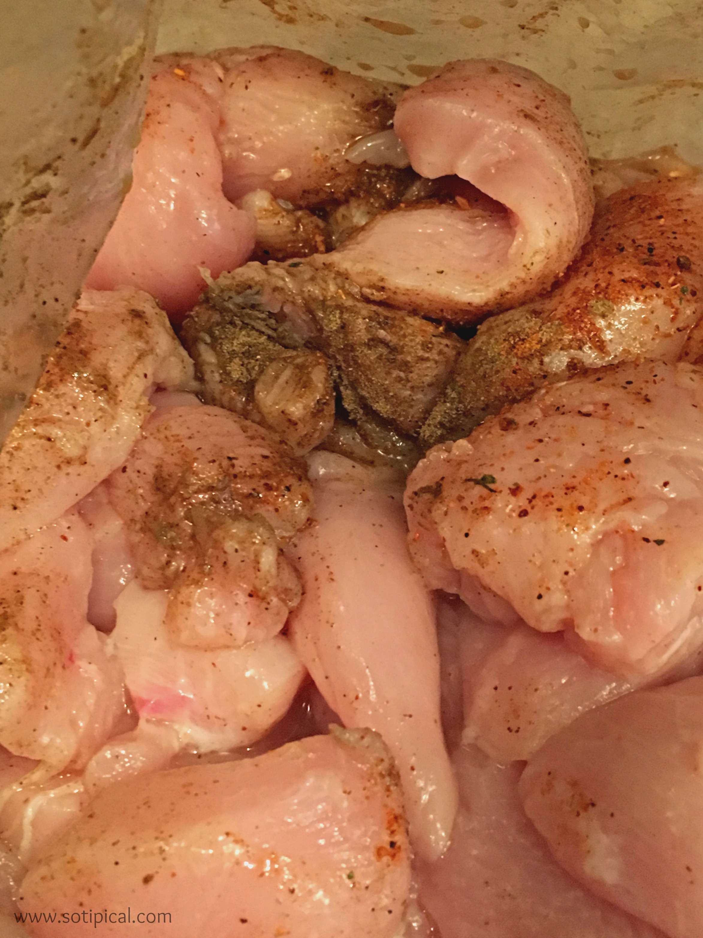 I began with 4 chicken breasts, sliced. I transferred them to a large plastic ziploc bag with 1/2 cup margarita mix, 2 TBSP tequila blanco, 1 tsp of cumin and 1 tbsp taco seasoning. Once sealing the bag, mix the seasoning around so it covers all of the chicken slices. Place in the refrigerator for at least 1 hour, though 2-4 hours would be even better. (You can marinate them longer if you wish.)